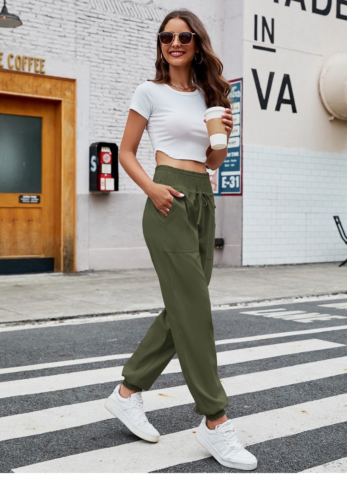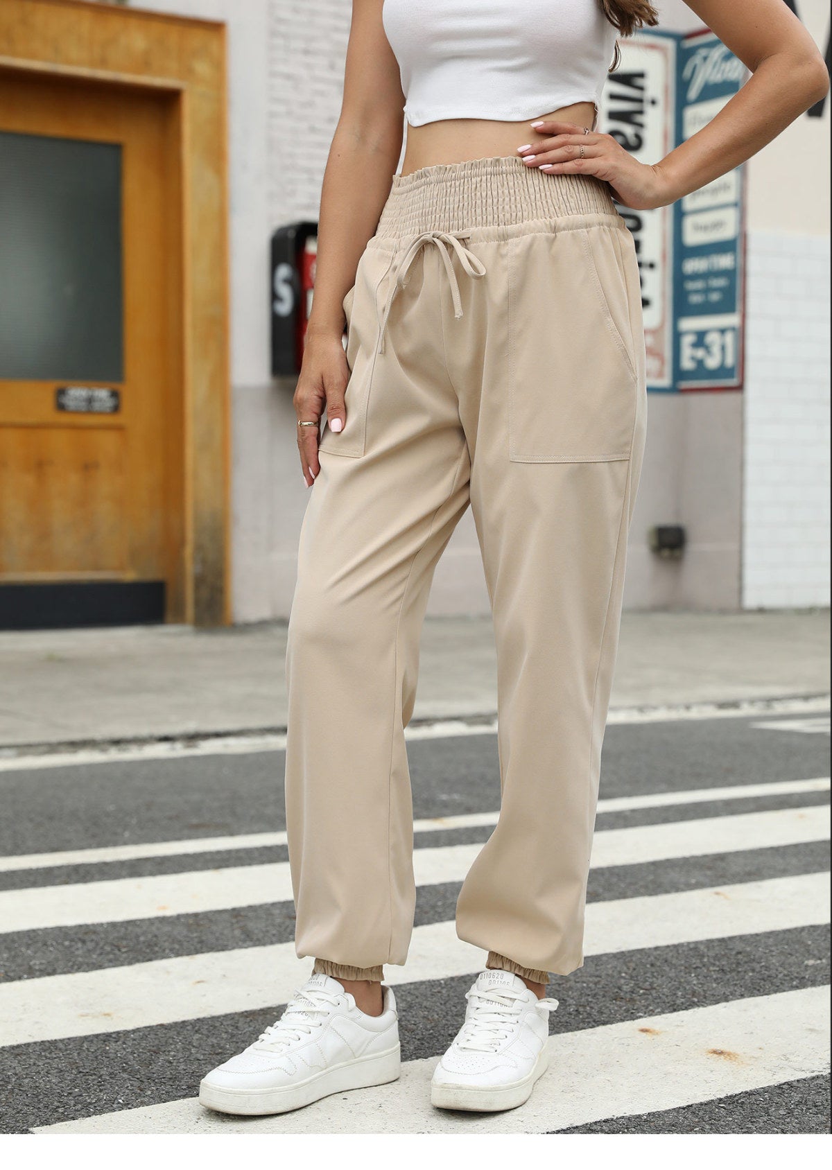 Casual Shirred Elastic High Waist Tie With Pocket Pants